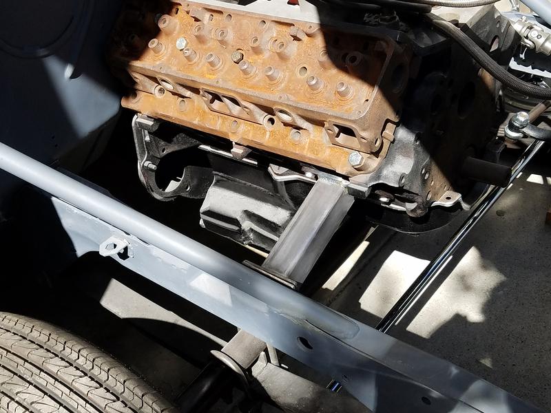 Before designing and fabricating the new engine mounts I made these temporary ones that are just a piece of channel iron that attaches to the heads and sits on the frame rails. Simple and effective lets you work designing the new mounts and is out of your way plus it keeps everything from moving around.