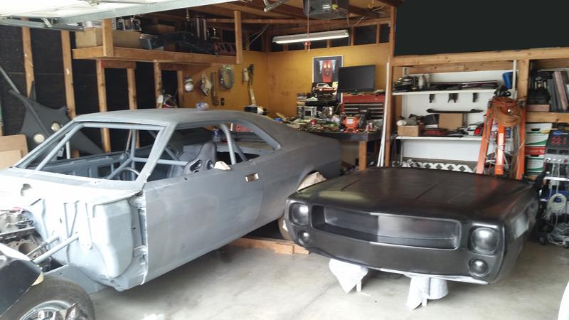 Below: I brought the front-end home and now sitting in the garage. You can see I made the mold to go all the way up to the window post but will trim it to the back of the hood and doors.